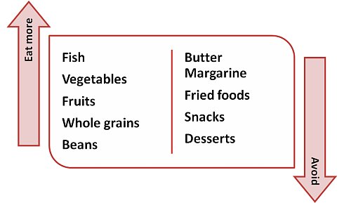 3- Always lower your total fat intake, by avoid eating saturated fats and trans-fatty acids (butter, margarine, fries, snacks and sweets); instead you can use monounsaturated and polyunsaturated fats (olive oils, peanut oil) in cooking.